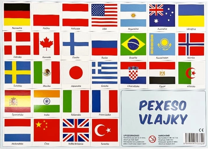 Jeu de société populaire pour enfants et adultes, qui entraîne la mémoire et élargit les connaissances sur les pays du monde. Contient 32 paires sur le thème des drapeaux nationaux, idéal pour un apprentissage ludique et des parties en famille.