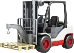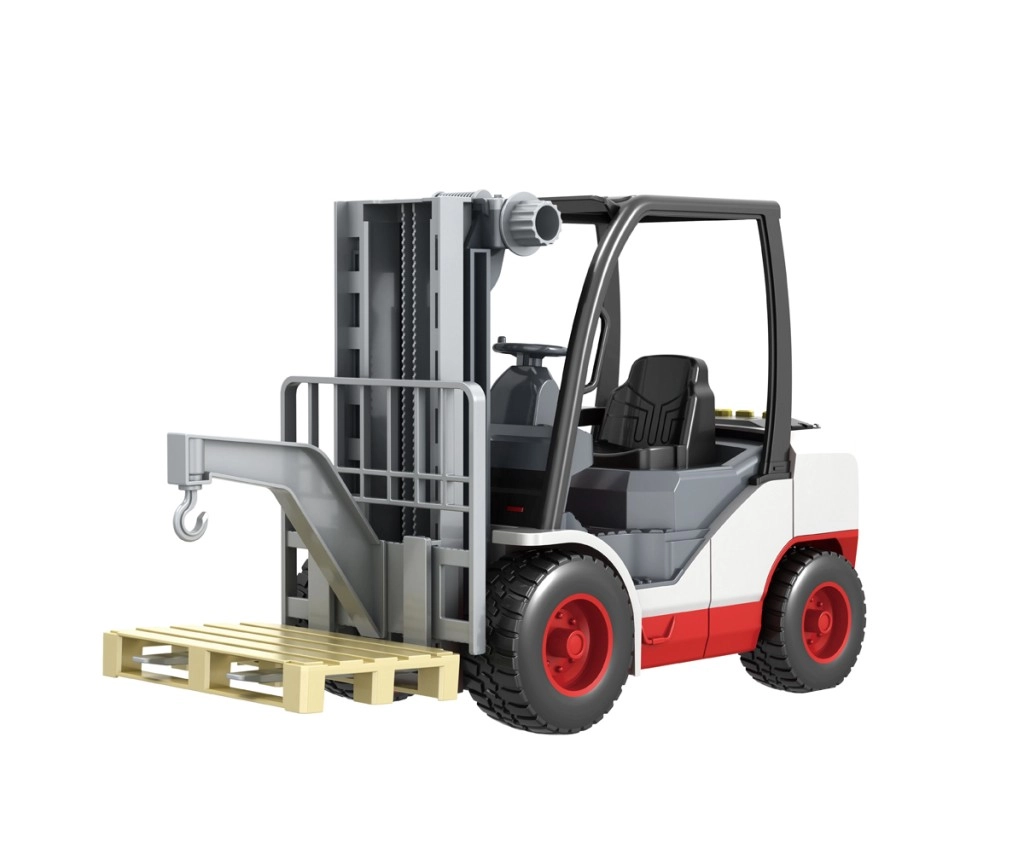Découvrez un chariot élévateur 1:12 finement détaillé, qui reproduit fidèlement les machines industrielles réelles. La combinaison de couleurs blanche, rouge et grise, le profil de pneus marqué et les fourches réalistes avec palette font de ce modèle un jouet attractif comme une pièce de collection.