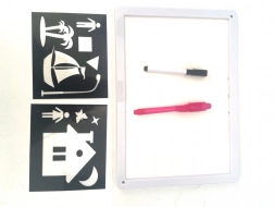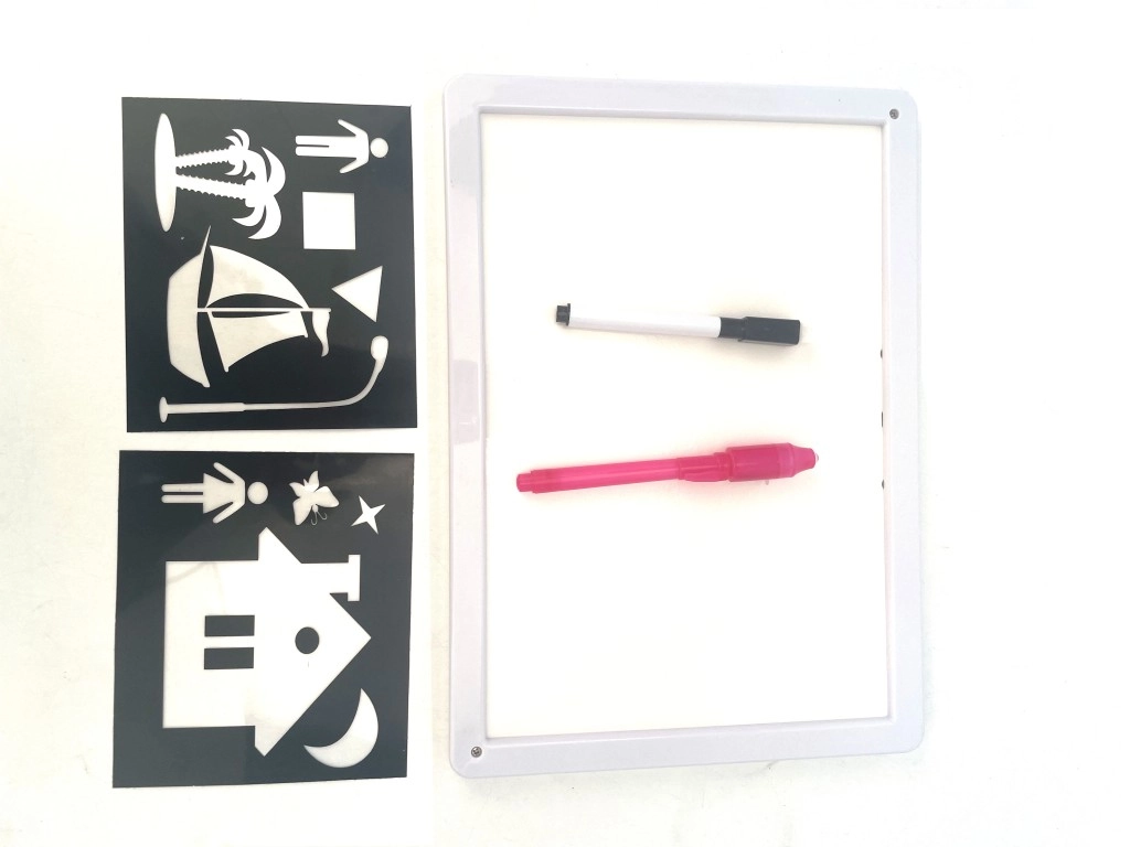 Découvrez un amusement sans désordre avec un outil créatif pour enfants dès 3 ans. Cette tablette de dessin légère au format A4 permet de dessiner à l’aide d’un stylo lumineux spécial et de créer de magiques images qui brillent dans l’obscurité. Grâce à sa conception double face, elle offre une double utilisation – dessin lumineux et dessin classique sur surface blanche. L’emballage comprend 2 stylos, des gabarits de formes et des piles LR44 pour une utilisation immédiate.