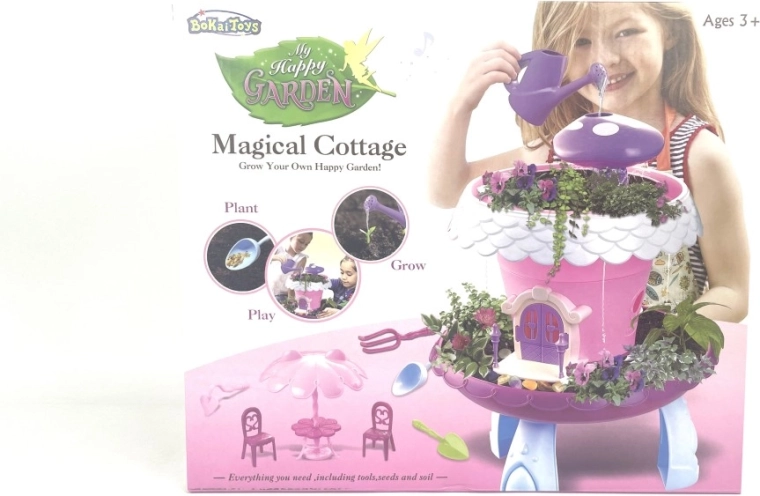 La boîte contient tout le nécessaire pour commencer immédiatement: pots, sachets de terre, paquet de graines et réservoir d’eau. Un arrosoir, quatre outils de jardinage pour développer la motricité fine et des décorations créant une ambiance chaleureuse sont également inclus. Les effets lumineux et musicaux alimentés par des piles LR44 (incluses) ajoutent une dimension interactive et stimulent l’imagination.