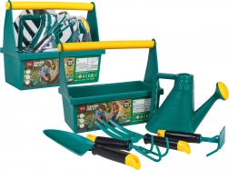 Le set comprend une pelle, un râteau, une fourche/cultivateur, une truelle et un arrosoir avec pomme amovible. Le tout est en plastique de qualité, lisse, agréable au toucher et facile à nettoyer. Idéal pour jouer au jardin, sur le balcon ou dans le sable.