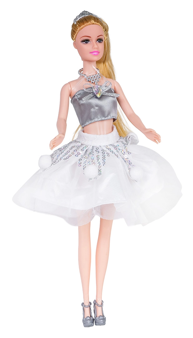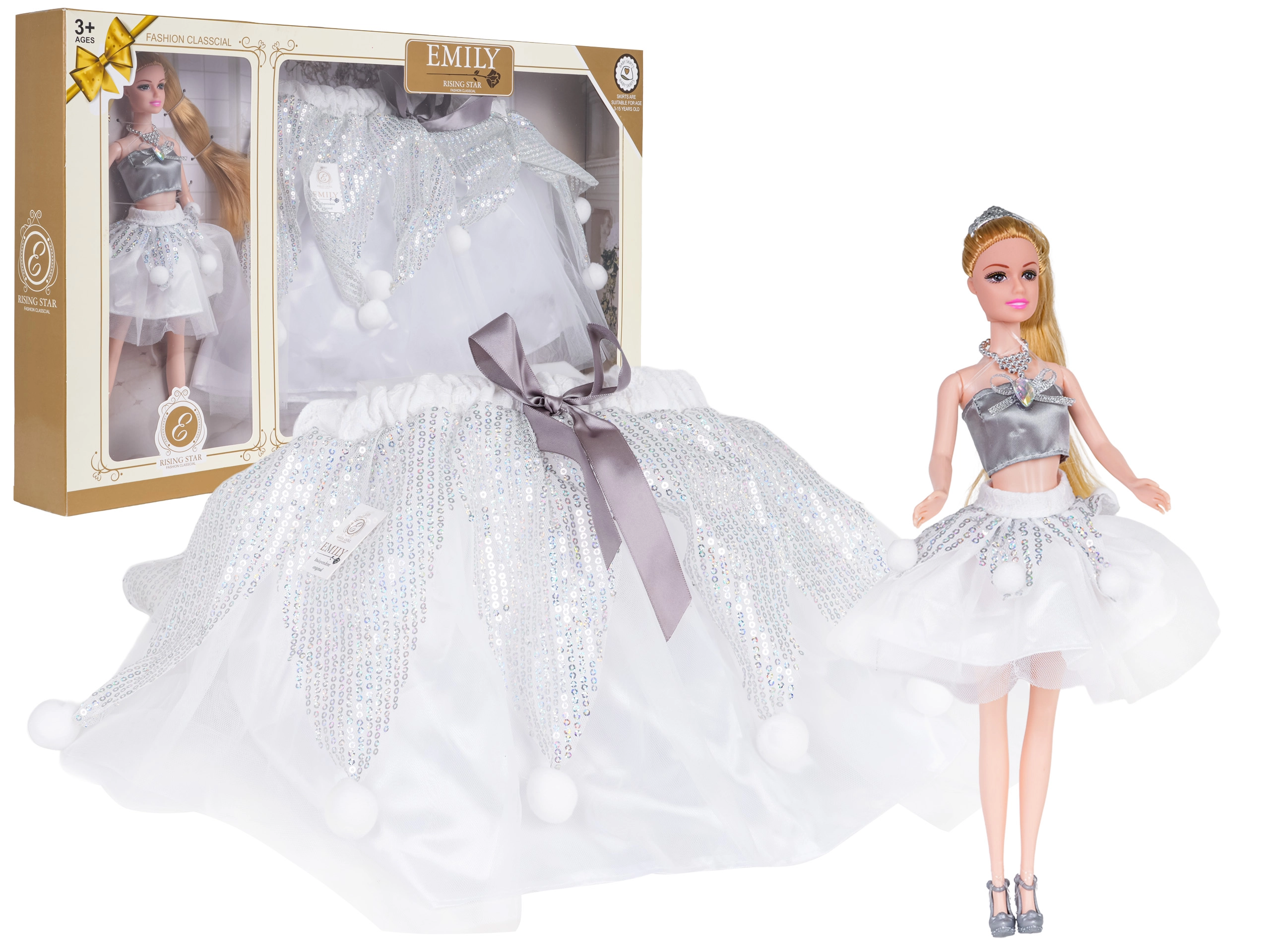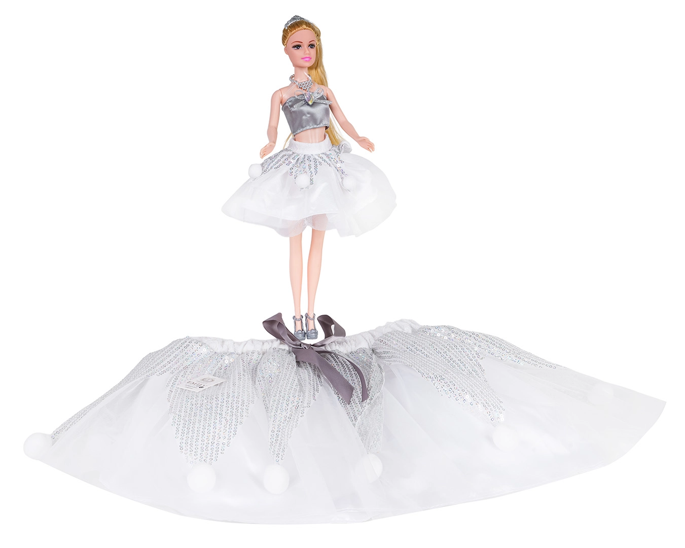 L’ensemble poupée + jupe enfant offre un look coordonné pour le jeu et les déguisements. La poupée est vêtue d’un top tendance et d’une jupe en tulle scintillante, possède de longs cheveux blonds à coiffer et des petites chaussures argentées. Dans le même style, l’enfant obtient sa propre jupe tutu duveteuse avec sequins et pompons ludiques pour se sentir magique.