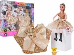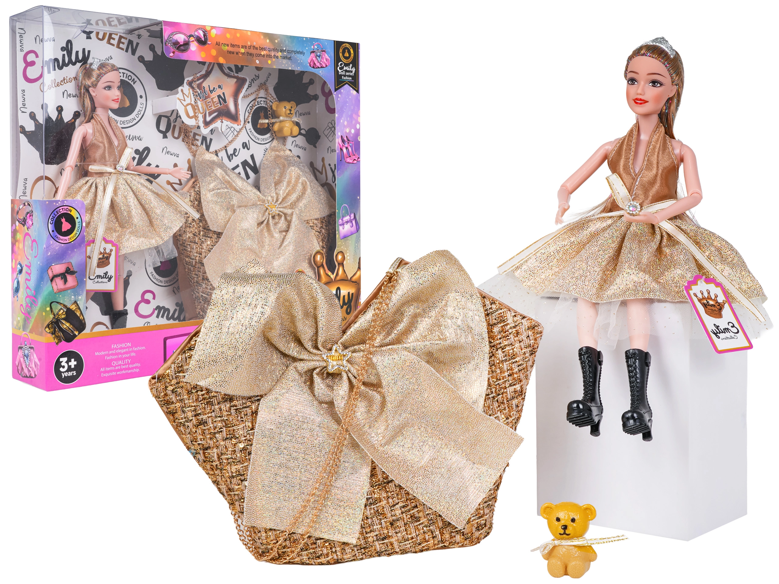 Découvrez un ensemble enchanteur qui allie jeu et style. La poupée EMILY en magnifique robe dorée, serre-tête et bottes hautes ravira chaque enfant. Inclus également, un sac à main spacieux et scintillant avec nœud dans lequel la poupée tient – parfait pour les sorties et la maternelle.
