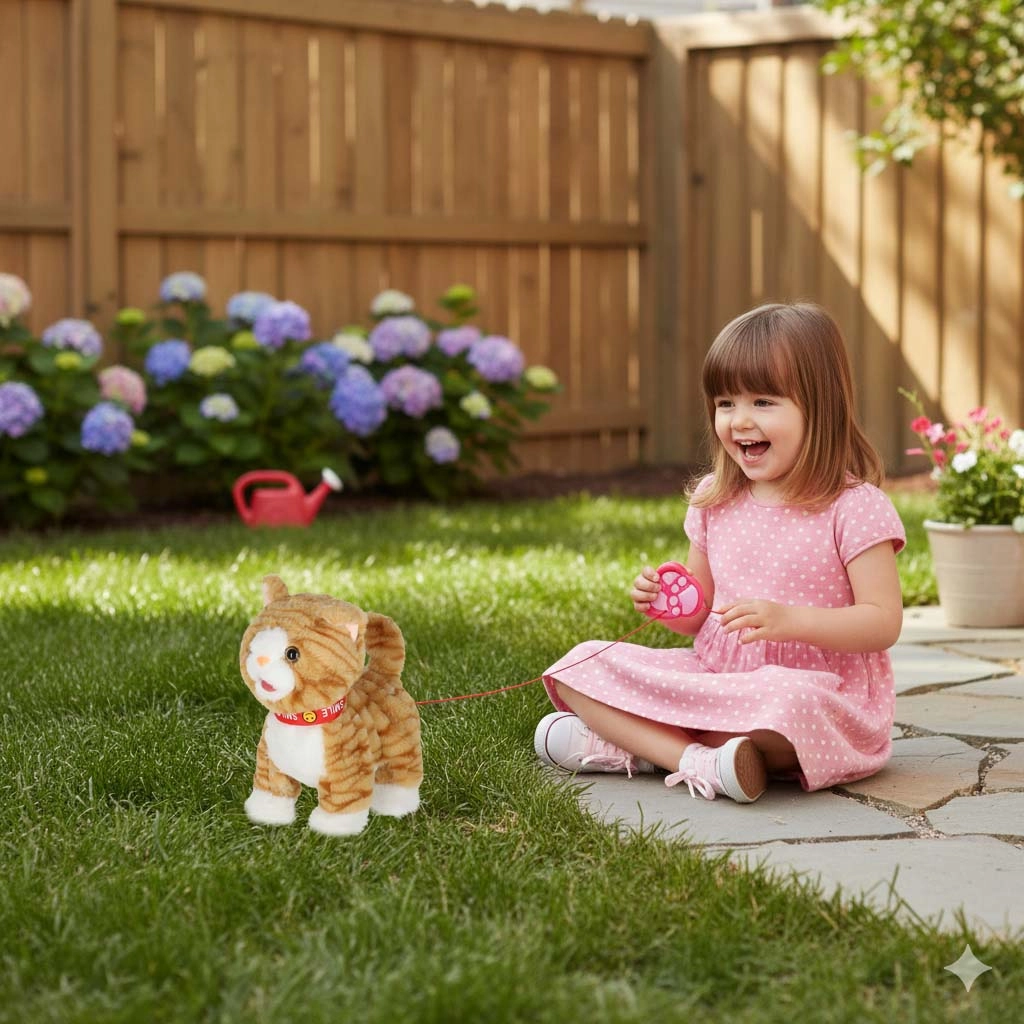 Grâce à la télécommande rose en forme de patte, le chat avance et accompagne le jeu avec des miaulements réalistes et des mélodies.
