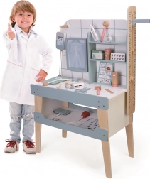 - Clinique complète à la maison – table d’examen avec étagères, cartes de patient, tableau optométrique, plaquettes de médicaments et autres accessoires.
