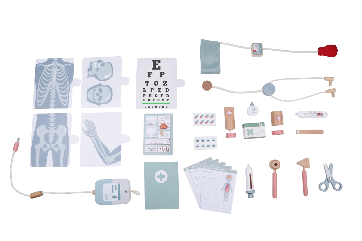 Ce set de jeu de rôle stimule l’imagination, l’interaction sociale et aide à réduire la peur de la visite chez le médecin. Des outils réalistes en bois de qualité et autres matériaux apprennent aux enfants à reconnaître les instruments médicaux, planifier les examens et prendre soin des « patients ».
