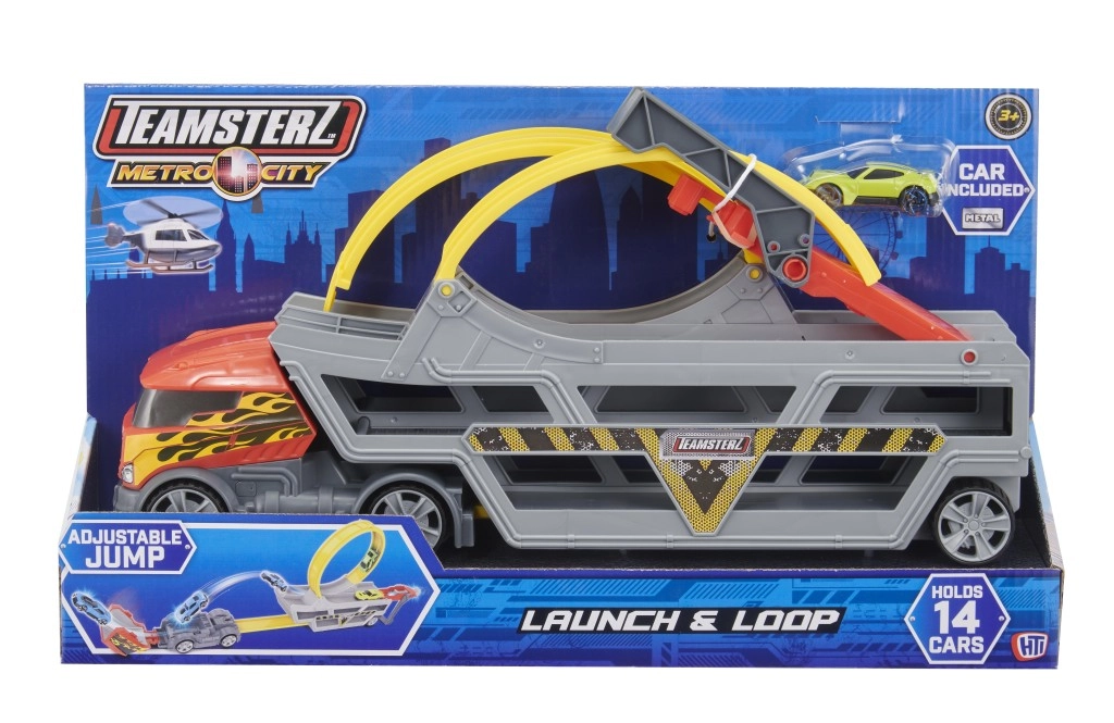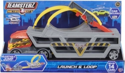 Découvrez un set de jeu amusant pour de jeunes pilotes : TEAMSTERZ transporteur multifonction avec petite voiture et looping. Ce robuste camion portable, en gris et rouge, propose une boucle (looping), une rampe pour les sauts, un lanceur à remontoir et de la place pour jusqu’à 14 petites voitures. Inclus : une petite voiture en métal die-cast pour jouer immédiatement.