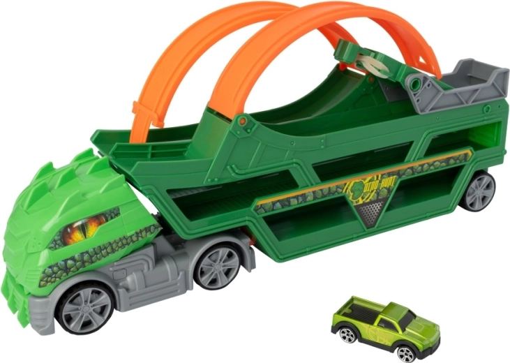 Le transporteur dinosaure Teamsterz est un choix idéal pour les petits pilotes et les fans de dinosaures. À partir d’un set portable compact, créez facilement une piste d’action avec boucle rabattable et lanceur qui propulse la voiture à travers la boucle et par-dessus le saut intégré dans la cabine. Le saut réglable permet de modifier la hauteur et la distance d’atterrissage pour des variantes de jeu infinies.