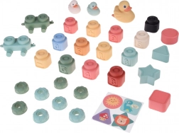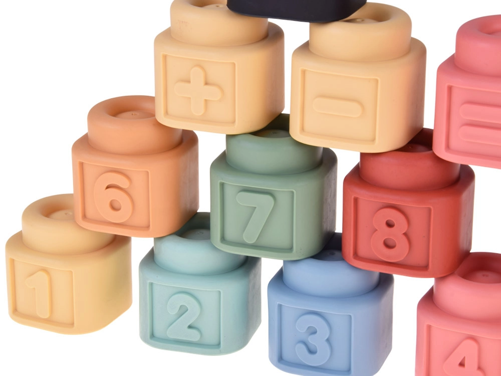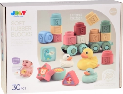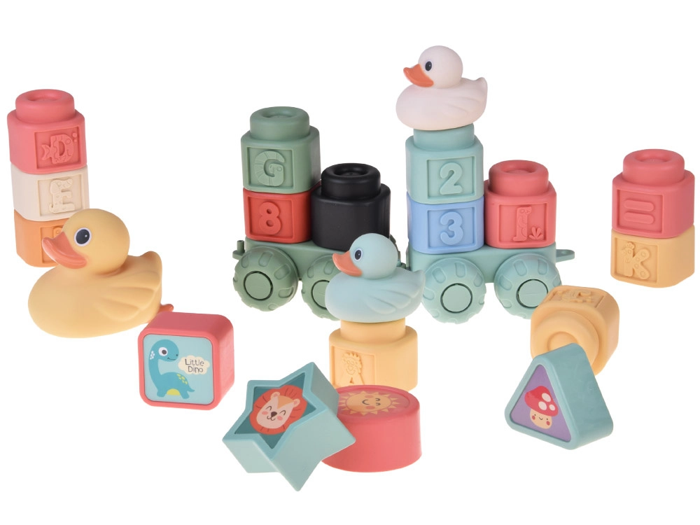 Un ensemble ludique et sûr pour les tout-petits : des blocs pastel souples avec motifs en relief de lettres, chiffres et animaux, accompagnés de charmants petits canards de bain. Le silicone/caoutchouc élastique et non toxique est agréable au toucher, idéal pour les petites mains et aussi comme anneau de dentition. Favorise la motricité fine, la coordination œil–main, l’apprentissage des couleurs, formes et chiffres et offre une foule de jeux créatifs à la maison comme dans l’eau.