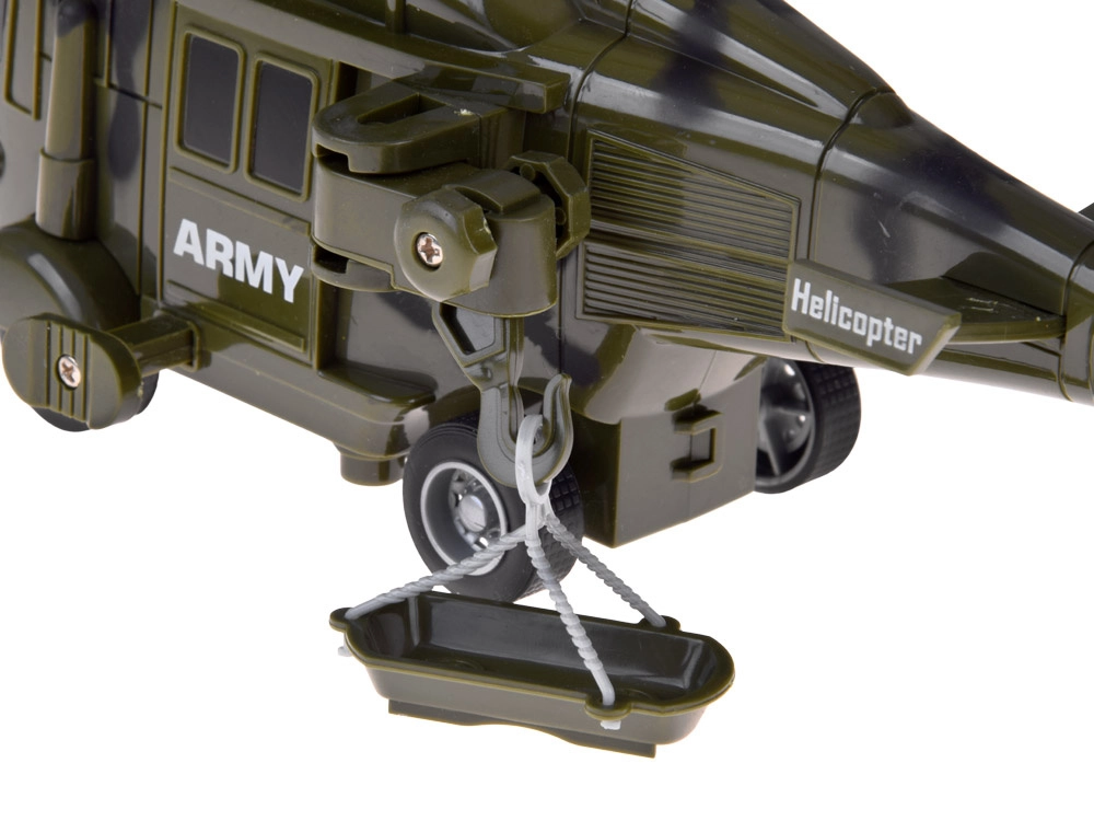 L’hélicoptère possède un rotor tournant et un treuil fonctionnel avec nacelle pour soulever de petits objets. Le char est équipé d’une tourelle pivotante et d’un canon mobile. Tous les modèles sont en vert camouflage avec marquages de type armée pour un réalisme maximal.