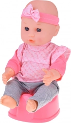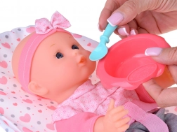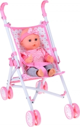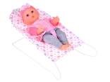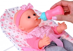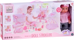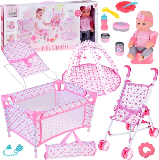 Faites plaisir aux enfants avec un set bien pensé pour les soins du poupon. Inclus : poupon aux membres articulés avec tenue douce, lit de voyage avec housse, transat avec ceinture de sécurité, tapis d’éveil avec arche et poussette pliante type « parapluie ». Également fournis : pot, biberon, bol avec cuillère et fourchette, hochet, tétine avec chaînette, boîtes « soin » et sac pour accessoires.