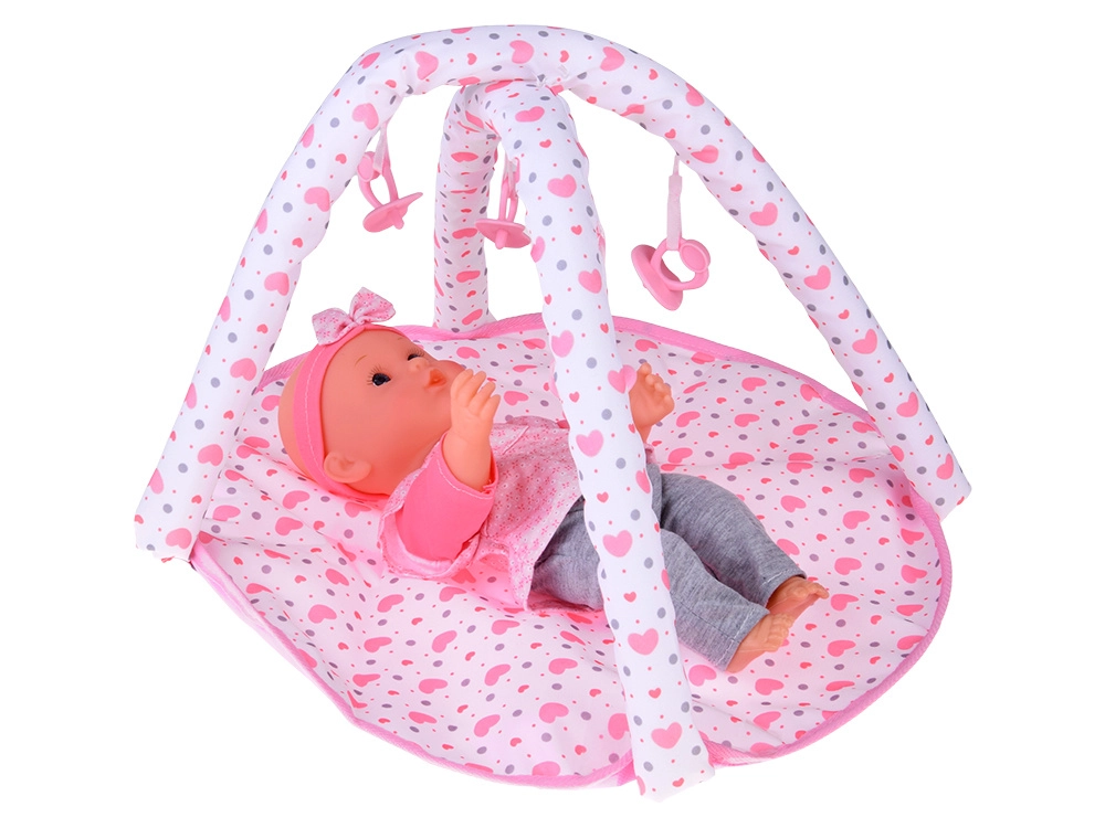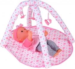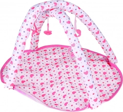 Tapis rond et moelleux avec jouets suspendus pour stimuler les sens et offrir un coin douillet de jeu et de repos au poupon.