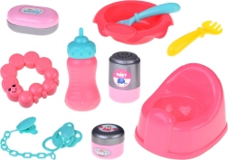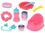 - poupon • bol • cuillère • fourchette • biberon • pot • tétine avec chaînette • hochet • 3 boîtes « soin » • poussette • transat • tapis d’éveil avec arche • lit de voyage avec housse • sac.