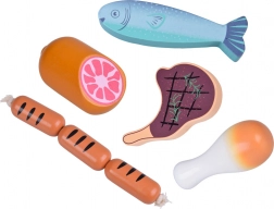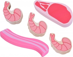 Steak, petites saucisses, salami, bacon, pilon de poulet, cuisse grillée, poisson et 3 crevettes – une combinaison variée pour cuisiner et jouer à la marchande sans fin.