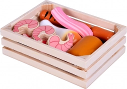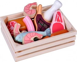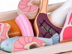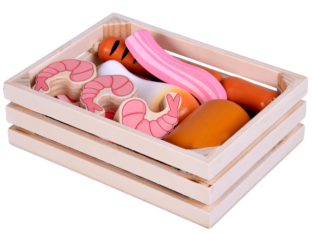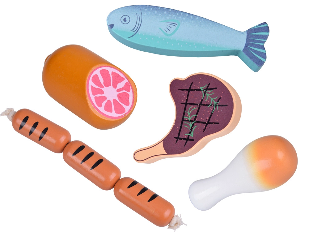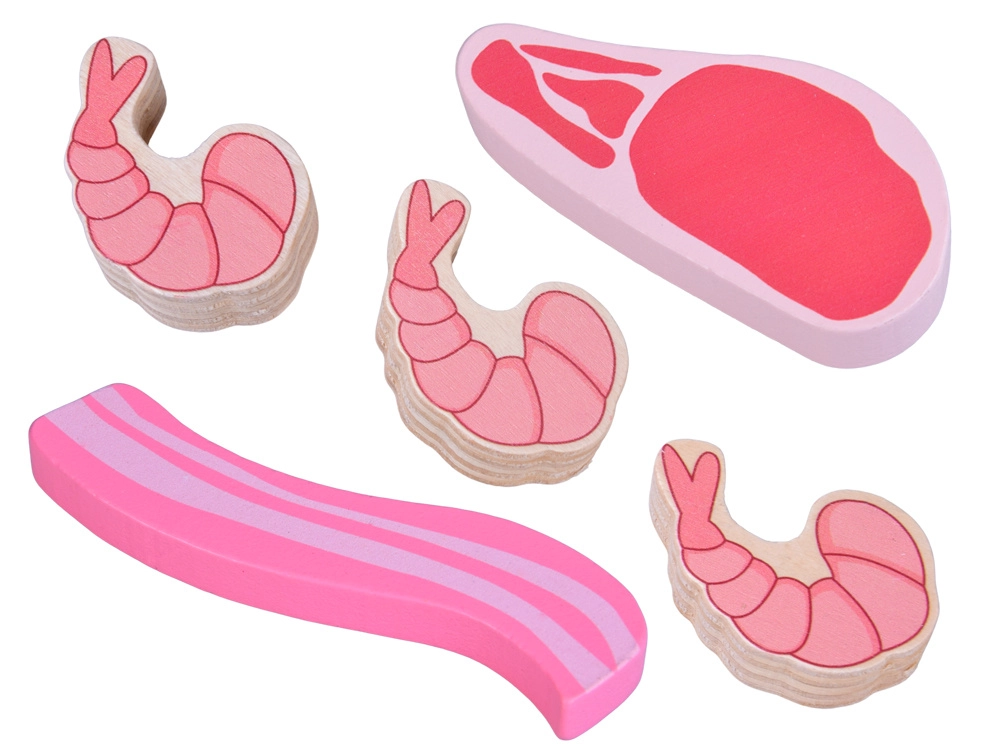 Ce set d’aliments en bois contient tout ce que les enfants connaissent de la cuisine ou du magasin : petites saucisses, salami, bacon, steaks, morceaux de poulet, poisson et crevettes. Les pièces sont solides, agréablement arrondies et peintes avec soin pour un rendu réaliste tout en restant totalement sûres pour le jeu.
