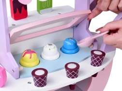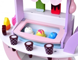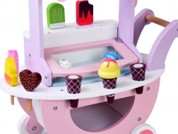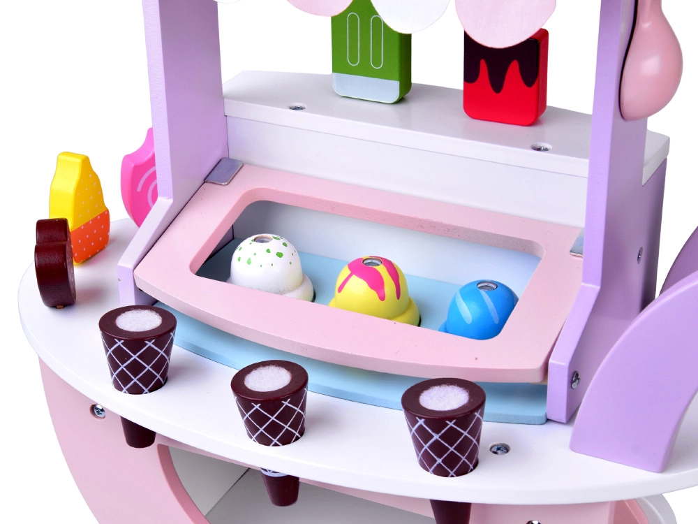 Adorable stand de glaces en bois aux couleurs pastels qui ravira les petits amateurs de glaces et de jeux de marchande. Il propose 8 glaces différentes, des boules magnétiques pour les cornets, une trappe relevable avec compartiment, une petite marquise à rayures et une poignée avec roulettes pour un déplacement facile. Favorise l’imagination, la motricité fine et le jeu social.