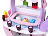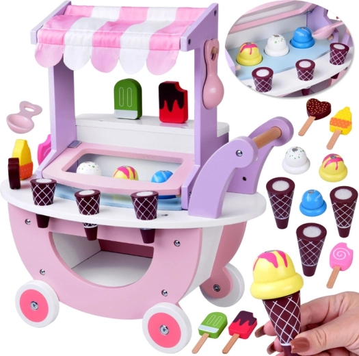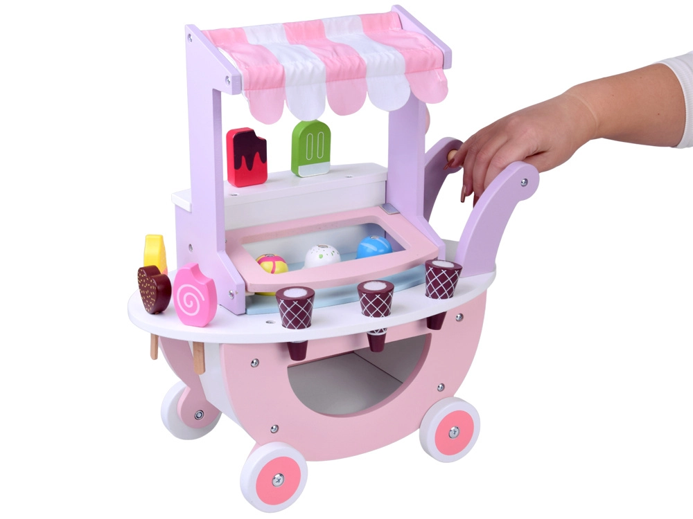 Le stand dispose d’un couvercle relevable avec compartiment intérieur pour ranger les accessoires, d’une marquise décorative à rayures et d’une poignée solide pour pousser ou tirer. Grâce aux roulettes, les enfants peuvent installer leur glacier mobile partout – dans la chambre, le couloir ou à la crèche.
