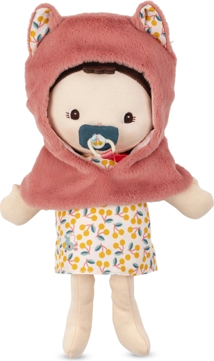 Une adorable capuche en peluche avec petites oreilles et une robe légère font de Jeanne une compagne câline et stylée pour le jeu au quotidien.