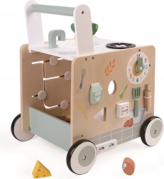 Grâce à son cadre en bois robuste, le chariot est stable et résistant, et les roues revêtues de caoutchouc garantissent un déplacement silencieux et sûr sur le sol. Des activités attendent sur les quatre faces : encastrement de formes (aliments), engrenages rotatifs, labyrinthe de légumes, évier avec robinet, plaque de cuisson et four transparent. Le chariot est un cadeau idéal pour les tout-petits dès 12 mois.