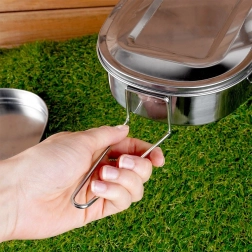 Grâce à sa construction robuste, la gamelle est durable, adaptée au contact alimentaire et simple à entretenir. Elle convient parfaitement à la randonnée, au camping, à l’école et au travail. Attention : les récipients ne sont pas conçus pour réchauffer des aliments et ne sont pas 100 % étanches (sans joint) – transporter les plats liquides en position verticale.