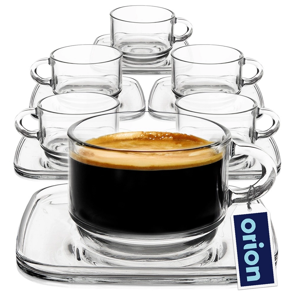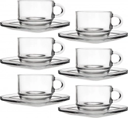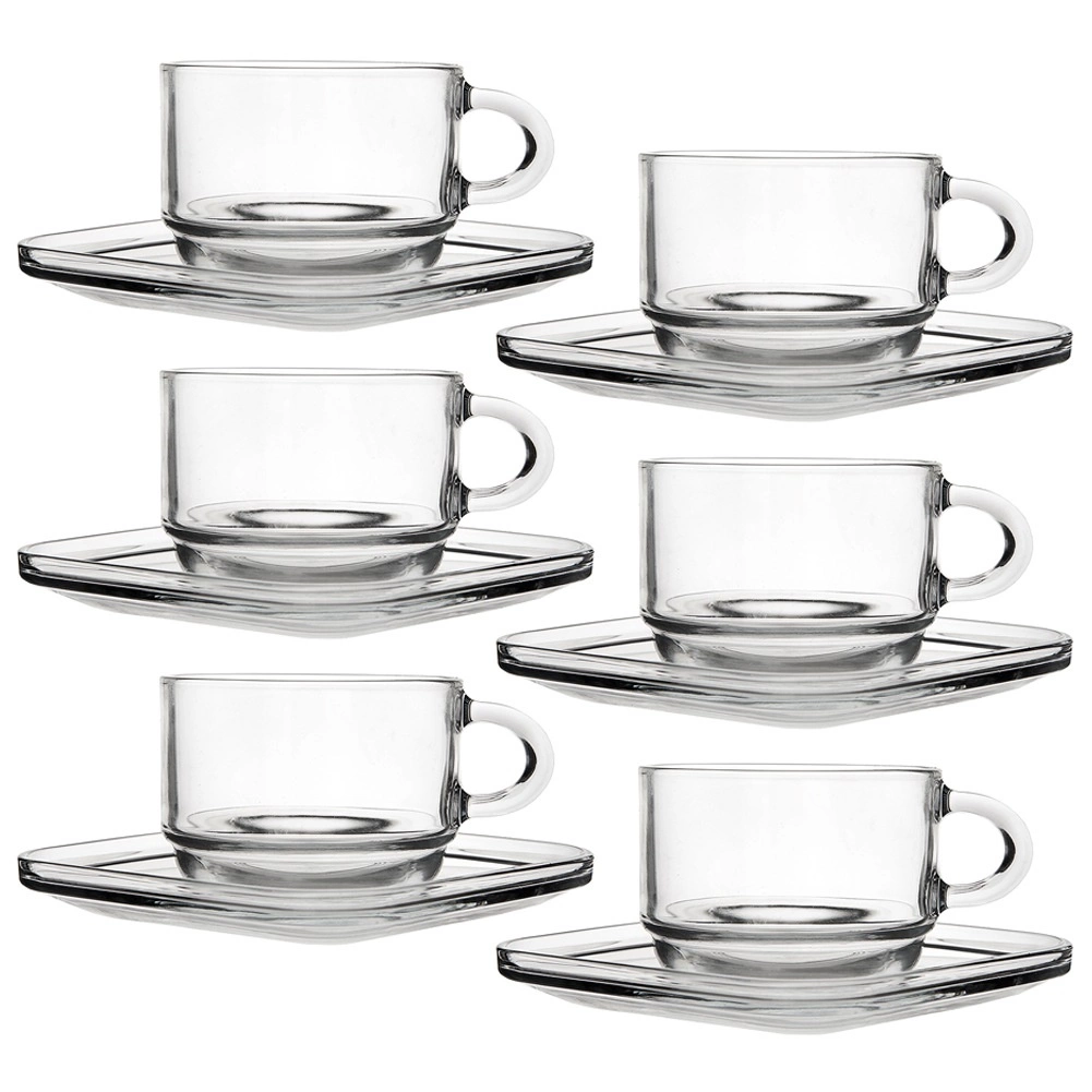 Élégant ensemble de six tasses en verre avec soucoupes carrées d’une capacité de 250 ml pour servir au quotidien le café, le thé et les infusions. Fabriqué en verre transparent de qualité qui met superbement en valeur la couleur de la boisson. Les tasses disposent d’une anse ergonomique pour une prise en main confortable, de soucoupes carrées modernes pour la stabilité et le style, et sont compatibles lave-vaisselle pour un entretien facile.