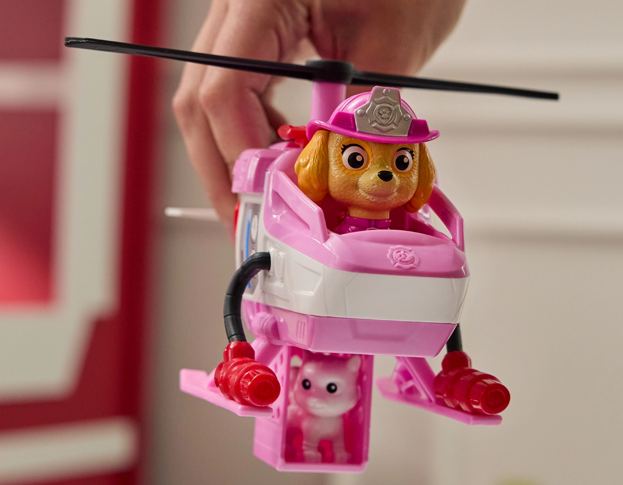 Skye, avec son casque rose, prend place dans le cockpit en tant que pilote. La tête articulée donne vie à chaque scène et stimule la narration.