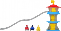 Une tour imposante avec toit rouge et rampe grise permet de lancer les véhicules depuis la hauteur et de créer des courses dynamiques ainsi que des opérations de sauvetage.