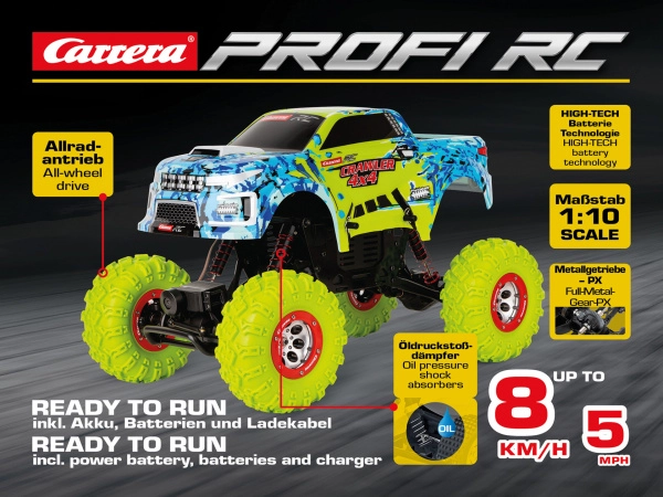 Le CARRERA PROFI Crawler tout-terrain est conçu pour les conditions exigeantes. Un châssis robuste, une garde au sol élevée et la transmission 4x4 viennent à bout des rochers, du gravier et de la boue. Les amortisseurs à huile assurent un excellent suivi du terrain et de la stabilité, tandis que la commande proportionnelle numérique précise vous donne un contrôle total sur chaque mouvement.