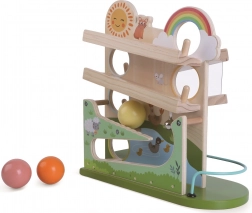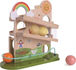 Ce circuit à billes créatif au design champêtre et rafraîchi transforme chaque séance de jeu en aventure colorée. Les enfants regardent les billes dévaler des pistes aux inclinaisons variées, disparaître dans des ouvertures puis réapparaître – le tout accompagné d’illustrations joyeuses du soleil, d’un arc-en-ciel et d’animaux. Une base stable et des éléments en bois soigneusement polis assurent une prise en main sûre même pour les plus petits.
