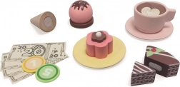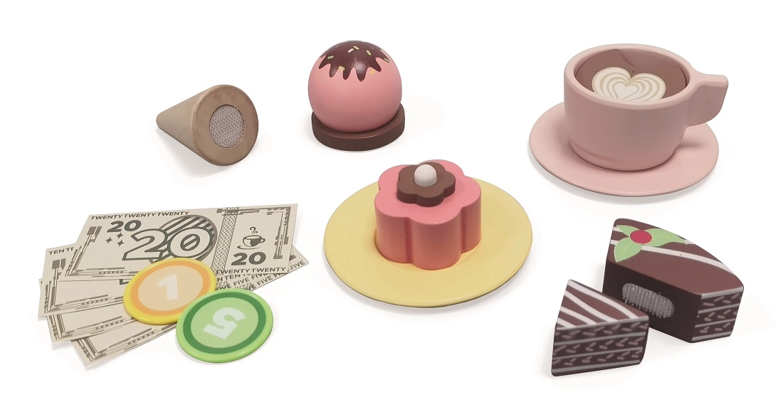 - 46 pièces pour un jeu varié — boissons, desserts, ustensiles et monnaie.