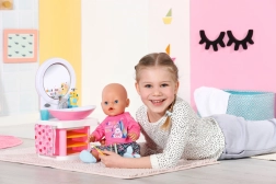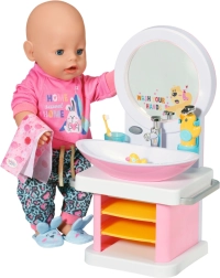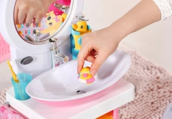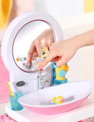 Apprenez de bonnes habitudes d’hygiène aux enfants en jouant. Le lavabo blanc et rose pour poupée BABY born propose des effets lumineux et sonores, un véritable jet d’eau en pressant le robinet et d’adorables accessoires pour un soin complet. Lorsque le miroir s’allume, une mélodie retentit et sert de minuteur ludique pour le lavage des mains.