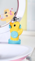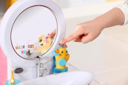 Le lavabo ludique pour poupée BABY born transforme l’hygiène quotidienne en jeu. En appuyant sur le bouton, le miroir s’illumine et une mélodie sert de minuteur pour le lavage des mains. Le distributeur de savon, l’eau qui coule en pressant sur le robinet et le bouchon en forme de petit canard rendent le jeu très réaliste. Sont inclus une brosse à dents, un gobelet avec sons de brossage des dents et une serviette.