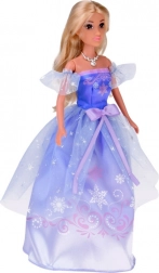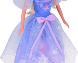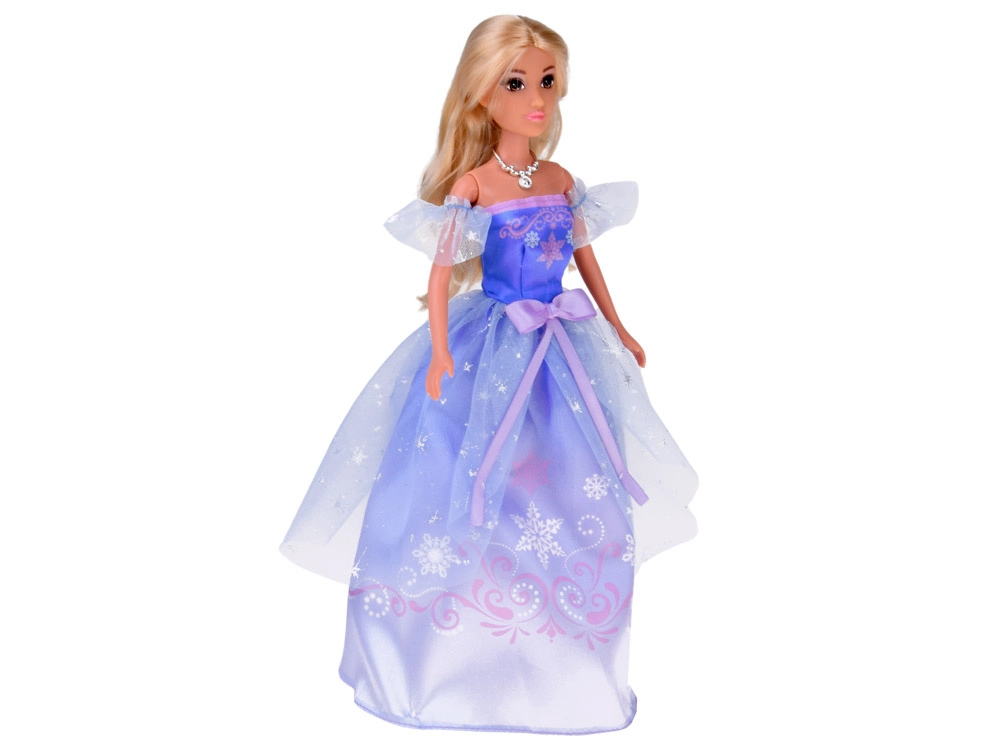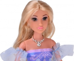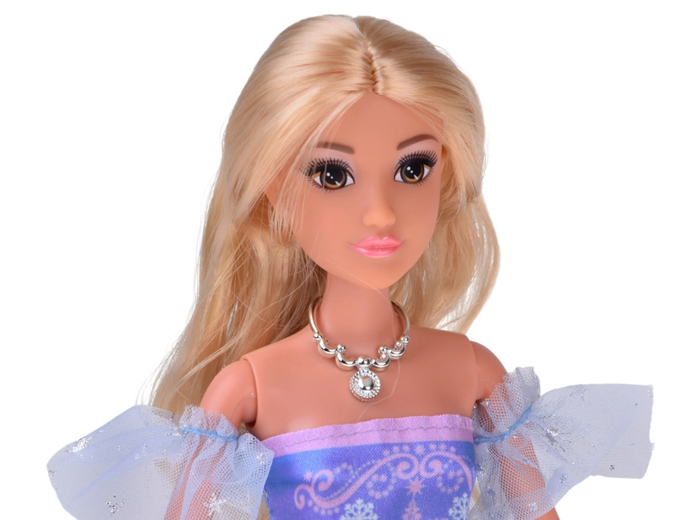 La princesse a de longs cheveux blonds à coiffer, une robe détaillée avec tulle et nœud, ainsi que des accessoires – diadème et collier. Les membres articulés facilitent les poses et le jeu.