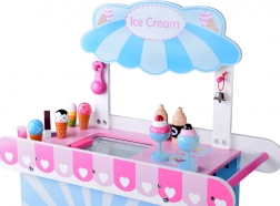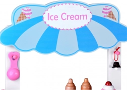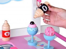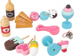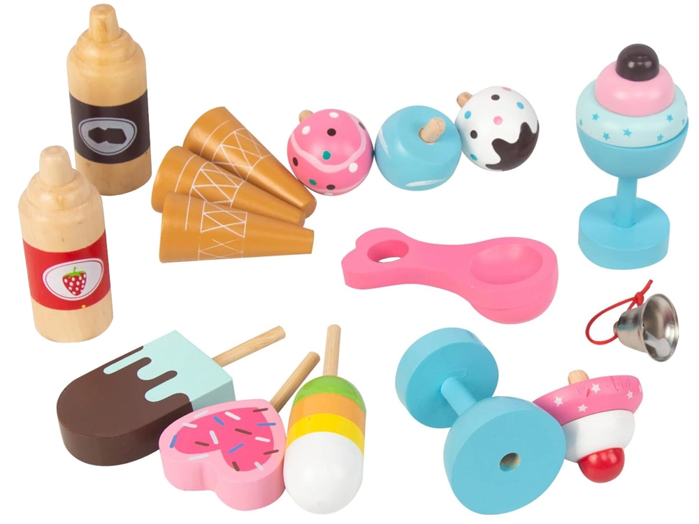 Sirops, coupes, cornets, esquimaux et cuillère à glace – tout pour une vraie pâtisserie, complété par une clochette et des crochets.