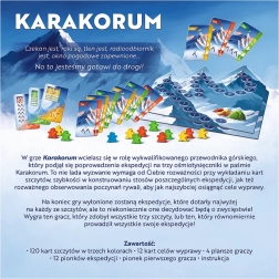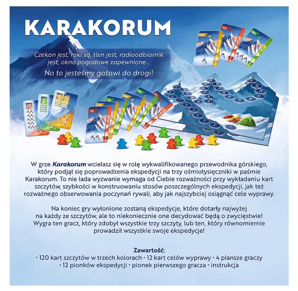 Devenez le roi des montagnes dans l’atmosphérique KARAKORUM: King of the Mountains. En tant que chef d’expédition, choisissez le bon moment pour poser les cartes des sommets, composez soigneusement les paquets de chaque tentative et adaptez-vous au rythme changeant de vos adversaires. Chaque décision rapproche votre équipe de l’objectif – conquérir trois légendaires huit-mille.