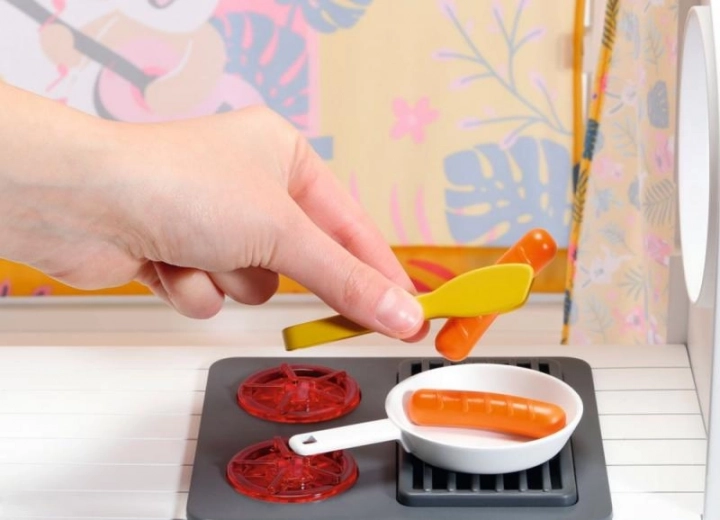 En plus du plaisir de servir les repas, les enfants peuvent utiliser la maison pour observer le coucher du soleil et coucher leurs poupées dans le coin nuit avec des accessoires roses.