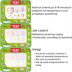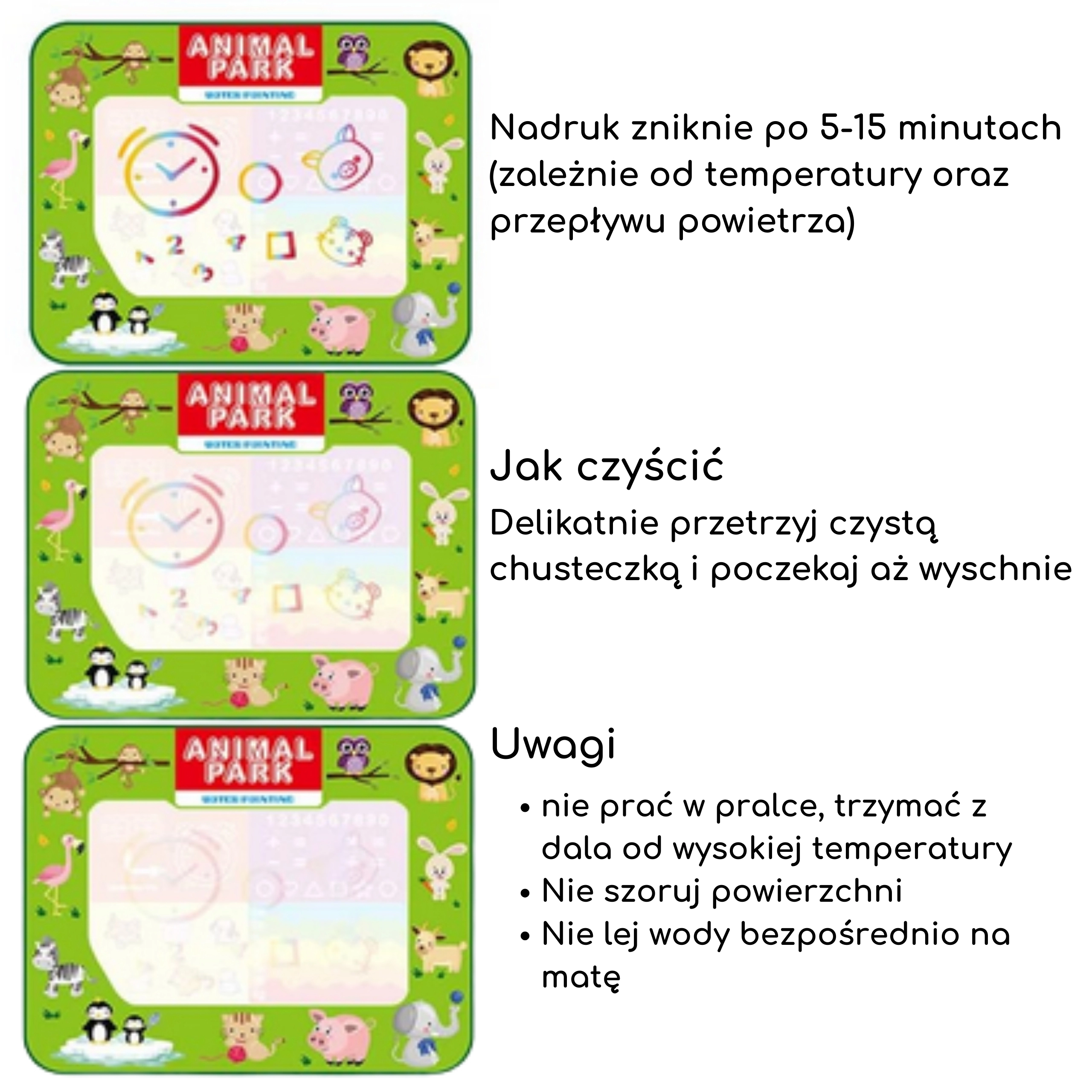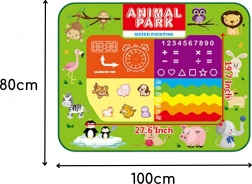 Le tapis à eau Woopie Animal Park est un choix idéal pour les enfants dès 3 ans. Grâce à une technologie à l’eau spéciale, on dessine sans encre ni peinture – uniquement avec de l’eau, donc sans taches ni salissures. L’impression recto-verso offre un contenu riche pour apprendre l’alphabet, les chiffres, les formes, les animaux ainsi que les bases des mathématiques et de la lecture de l’heure. Le grand format 100 × 80 cm est parfait pour créer en solo ou jouer ensemble avec les frères et sœurs.