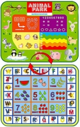 - Design éducatif recto-verso : alphabet, chiffres, animaux, exercices, horloge et formes géométriques.