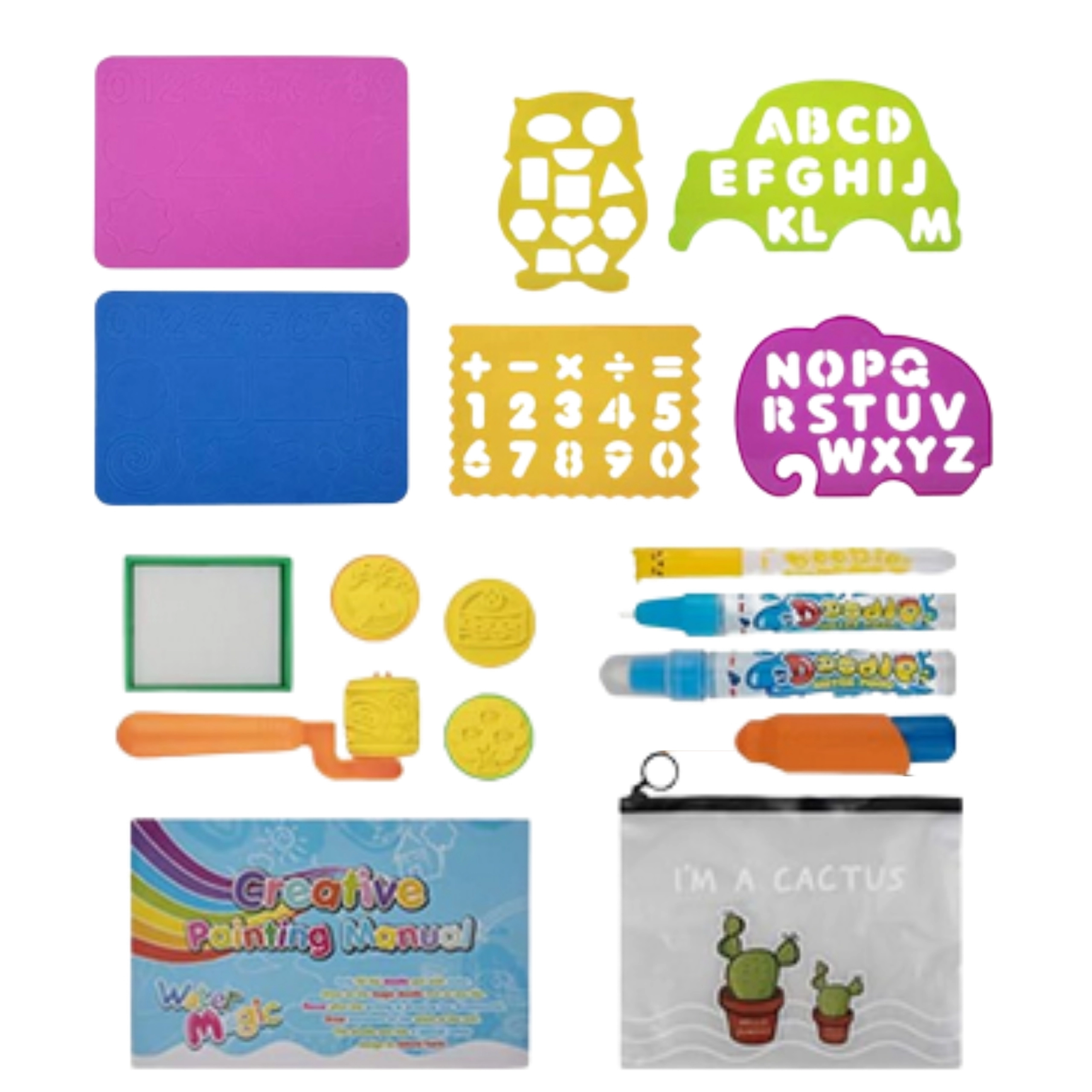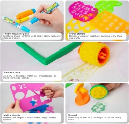 - Accessoires variés : feutres à eau, rouleau, tampons et pochoirs.