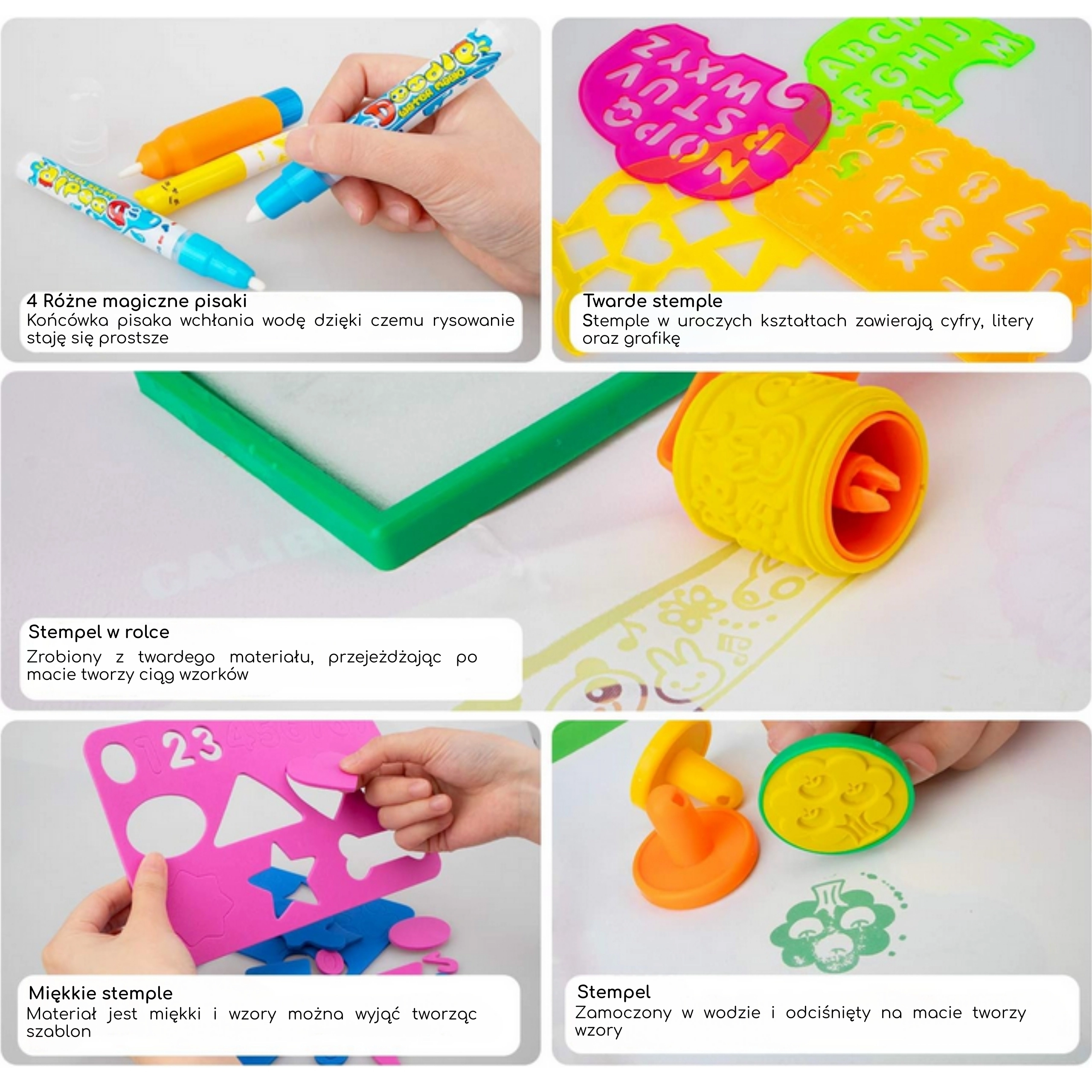 Le coffret comprend 2 feutres à eau, un rouleau avec poignée, 3 tampons et 2 pochoirs éducatifs pour multiplier les possibilités créatives. Le tapis est léger, facile à ranger et fabriqué avec des matériaux sûrs, non toxiques et certifiés. Utilisable à la maison comme au jardin, il stimule la créativité, la coordination œil-main et les compétences linguistiques, le tout sous forme de jeu.