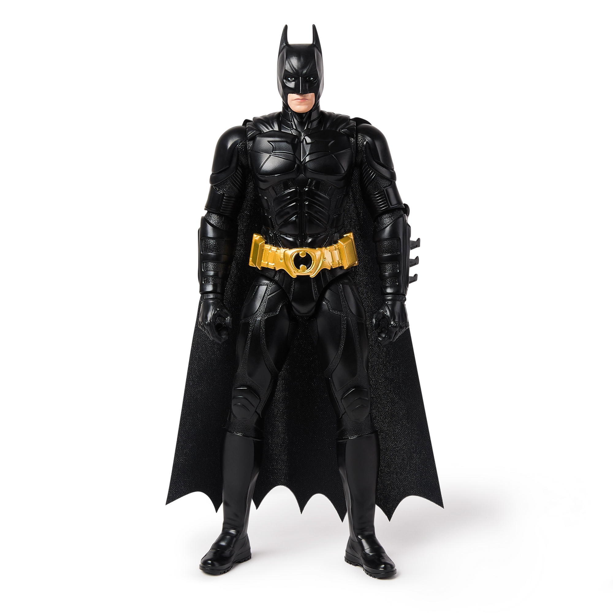 Costume noir avec ceinture dorée, armure moulée et longue cape reproduisent fidèlement le design de BATMAN dans The Dark Knight.
