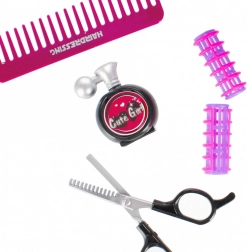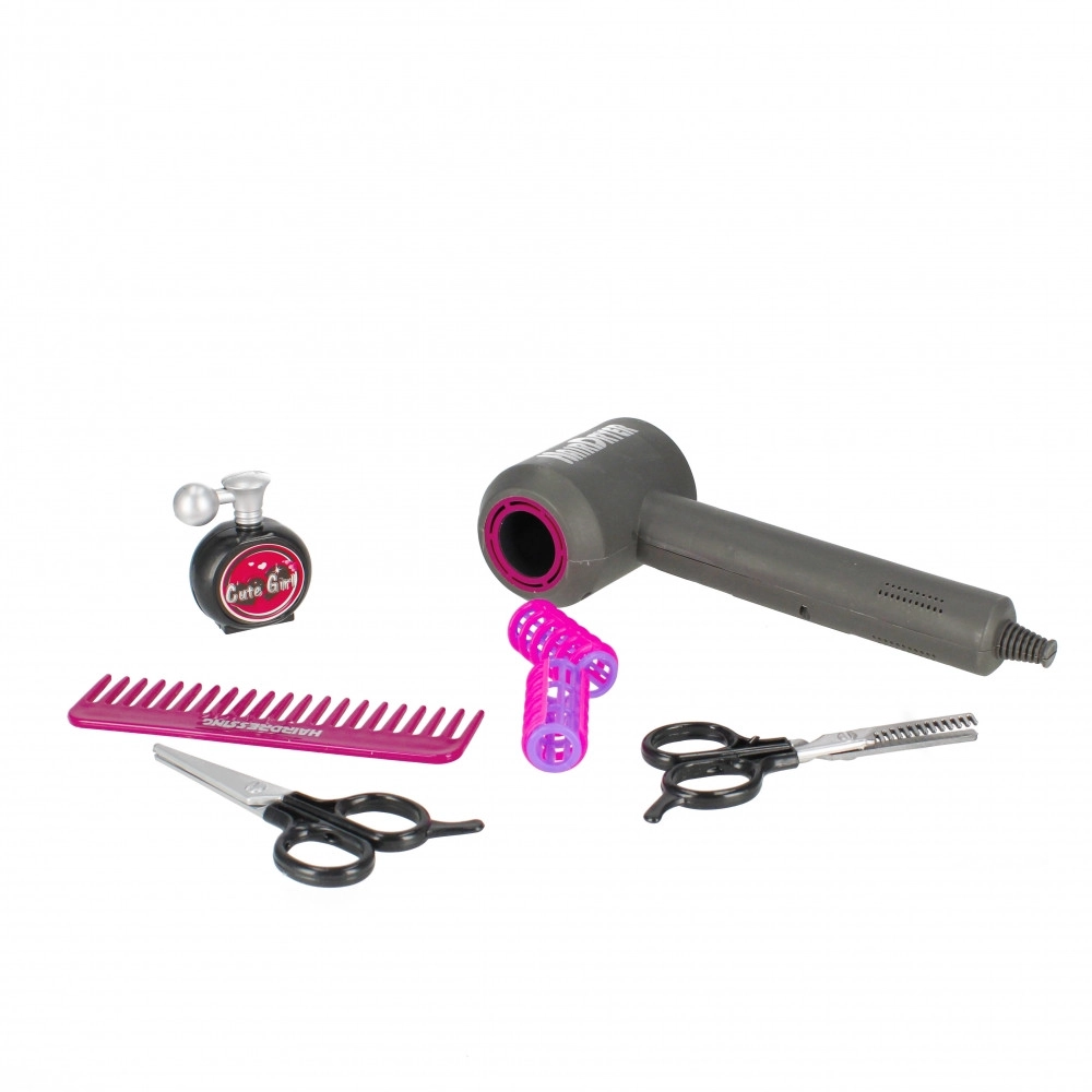 - Sèche-cheveux, peigne, 2× bigoudis, 2× ciseaux, 1× pulvérisateur