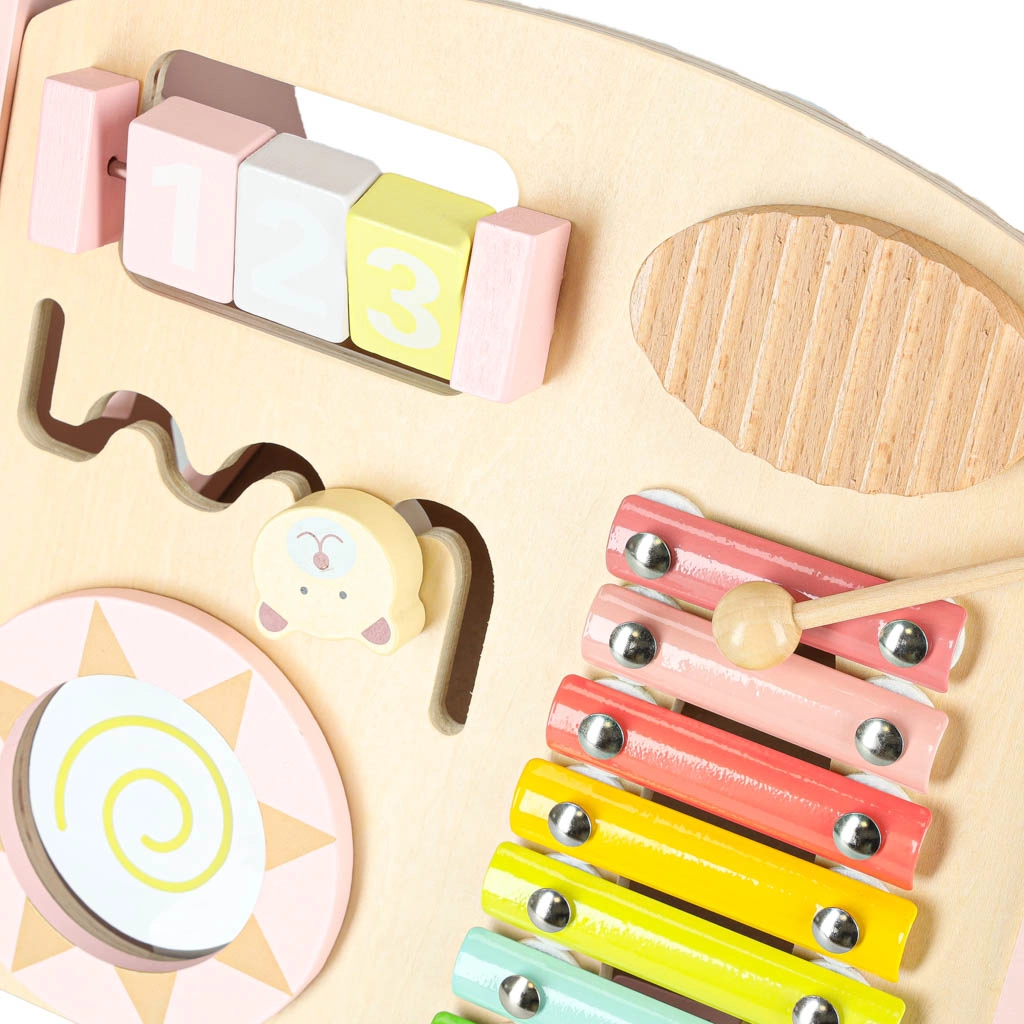 Ce chariot de marche en bois au style soigné, dans une teinte rose pastel, favorise l’équilibre, la coordination et l’assurance à la marche. Le panneau avant regorge d’activités : un boulier pour les premiers calculs, un xylophone pour explorer les sons, des roues dentées, un disque rotatif, un jeu d’encastrement et des éléments coulissants qui développent la motricité fine et la concentration.