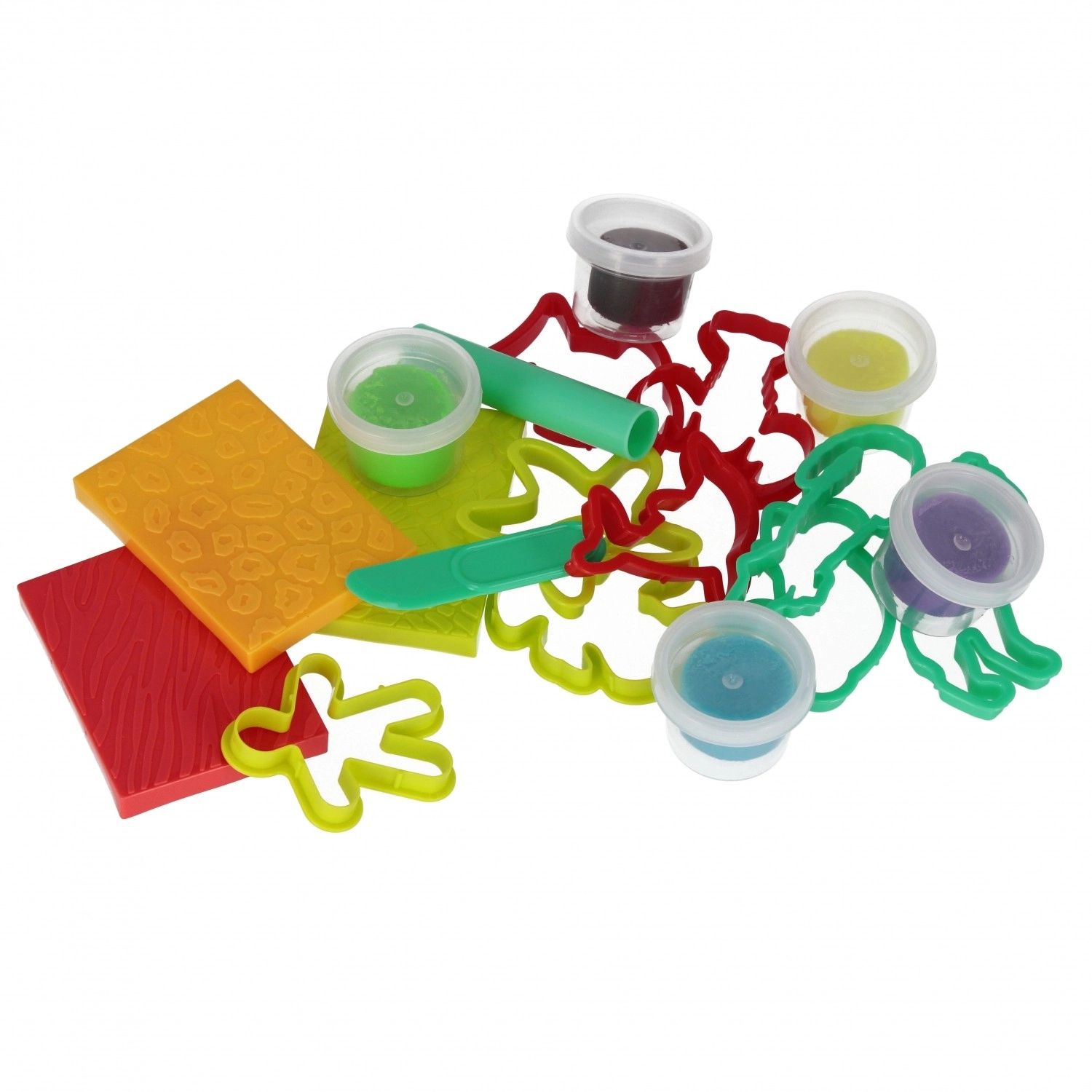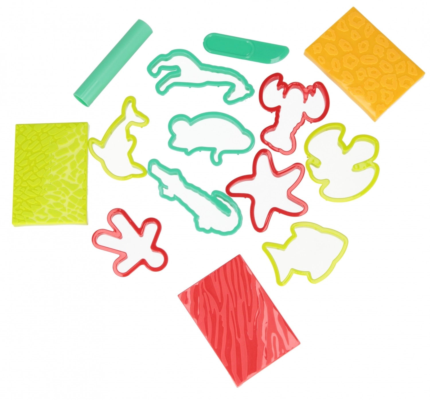Différents moules et éléments texturés permettent de créer des animaux et des motifs. Idéal pour développer l’imagination et la motricité fine.