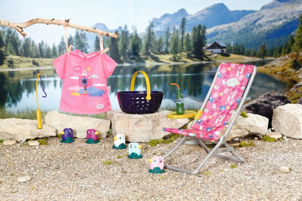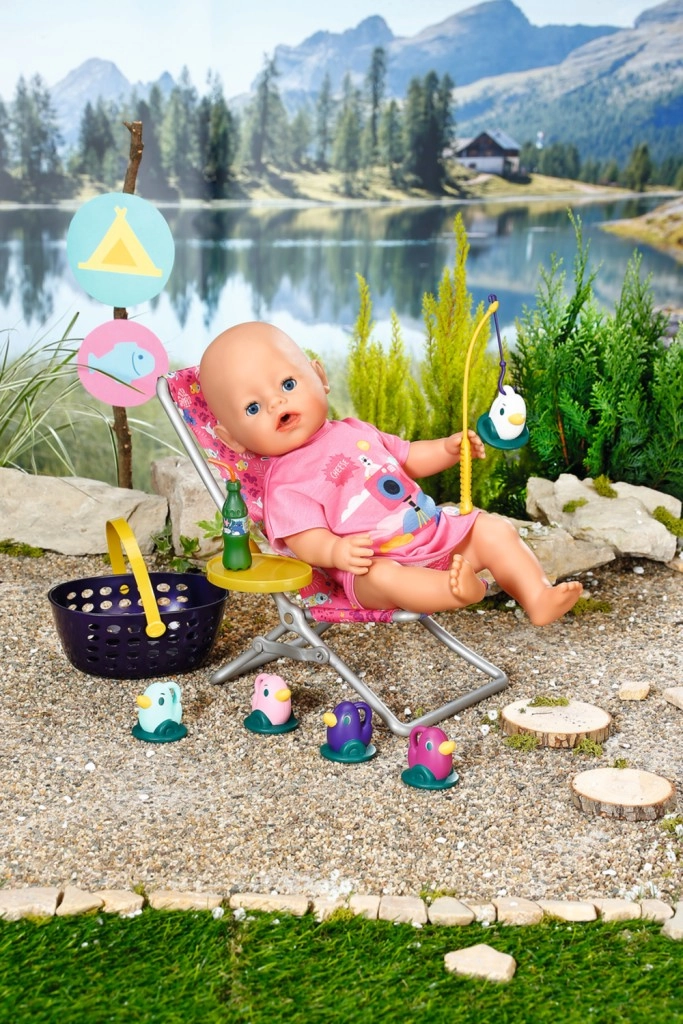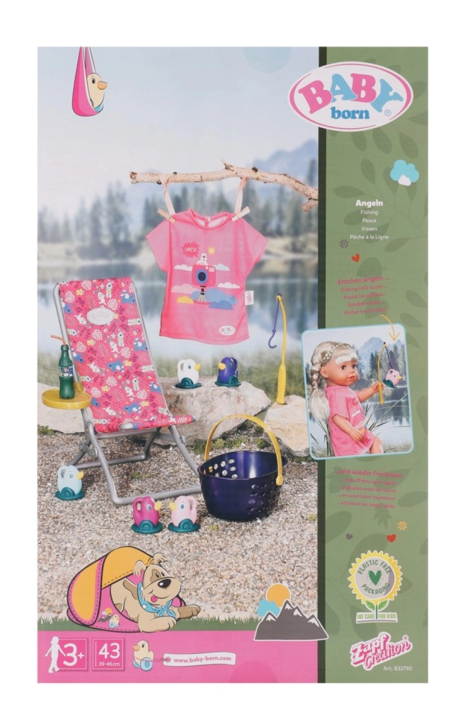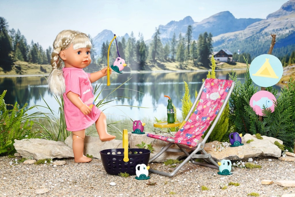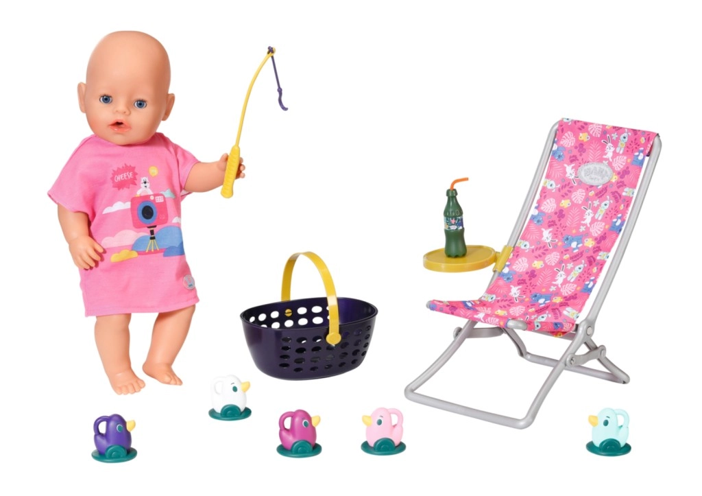 « Il y a bien plus de poissons dans la mer… » Mais BABY born préfère attraper de jolis petits canetons. Confortablement installée dans un transat rose à motif coloré, elle essaie d’attraper l’un des cinq canards avec l’hameçon de sa canne à pêche. De temps en temps, elle sirote une limonade posée sur la table jaune à côté du transat. Lorsqu’elle a repêché tous les canards et les a rangés dans le panier bleu, elle les remet dans l’étang et le jeu amusant peut recommencer. Pour cette partie de pêche, BABY born porte un long t-shirt rose décontracté avec un adorable imprimé. • Accessoires de qualité pour la poupée BABY born originale. • Pour le plaisir d’un jeu créatif, varié et durable. • Convient aux poupées de 36 cm et 43 cm. L’ensemble de week-end pour la pêche BABY born comprend une tenue, un transat avec table, une bouteille de limonade, un panier, 5 canards et une canne à pêche.