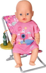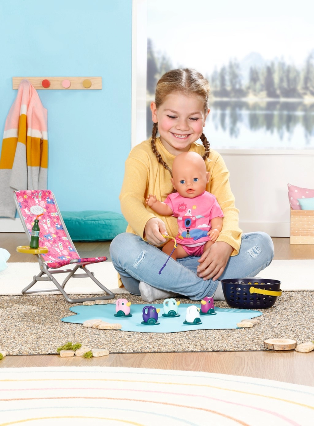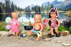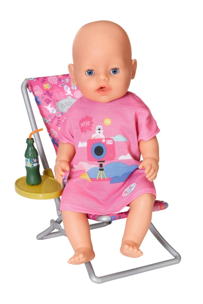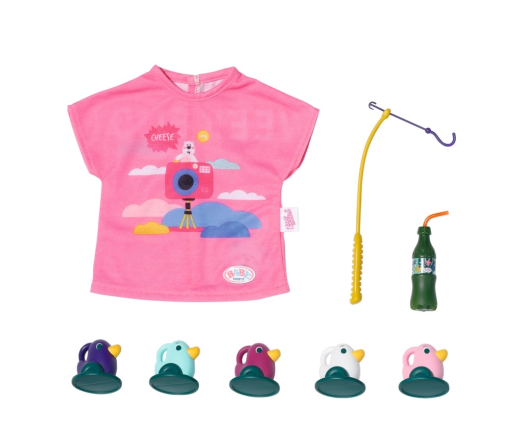 « Il y a bien plus de poissons dans la mer… » Mais BABY born préfère attraper de jolis petits canetons. Confortablement installée dans un transat rose à motif coloré, elle essaie d’attraper l’un des cinq canards avec l’hameçon de sa canne à pêche. De temps en temps, elle sirote une limonade posée sur la table jaune à côté du transat. Lorsqu’elle a repêché tous les canards et les a rangés dans le panier bleu, elle les remet dans l’étang et le jeu amusant peut recommencer. Pour cette partie de pêche, BABY born porte un long t-shirt rose décontracté avec un adorable imprimé. • Accessoires de qualité pour la poupée BABY born originale. • Pour le plaisir d’un jeu créatif, varié et durable. • Convient aux poupées de 36 cm et 43 cm. L’ensemble de week-end pour la pêche BABY born comprend une tenue, un transat avec table, une bouteille de limonade, un panier, 5 canards et une canne à pêche.