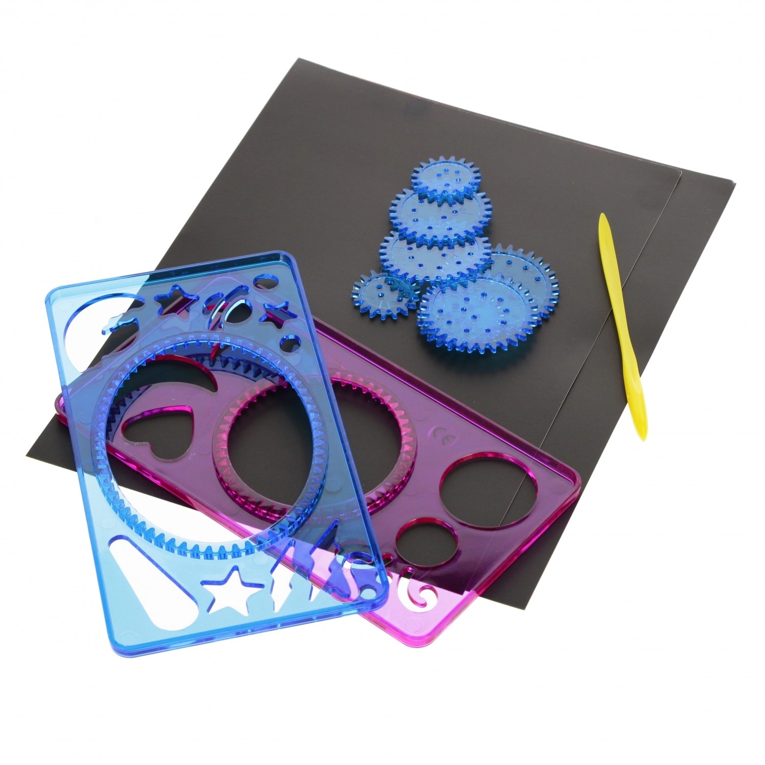 Le coffret comprend des gabarits, des roues dentées, un stylet/stylo et des feuilles – commencez à créer dès l’ouverture, sans achats supplémentaires.