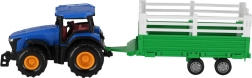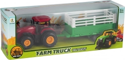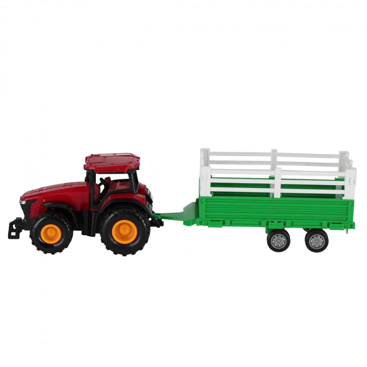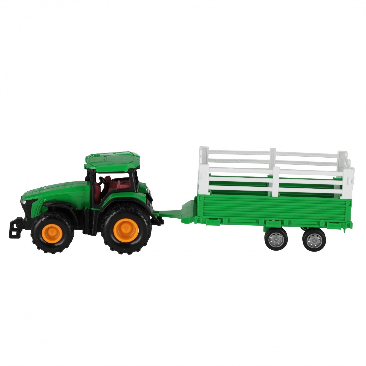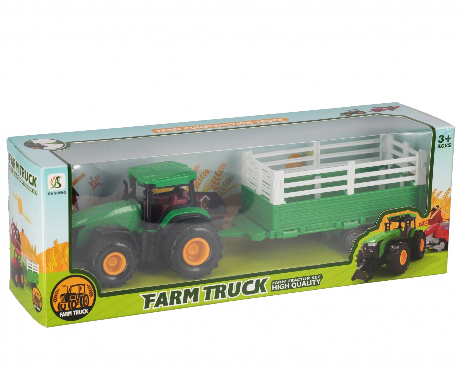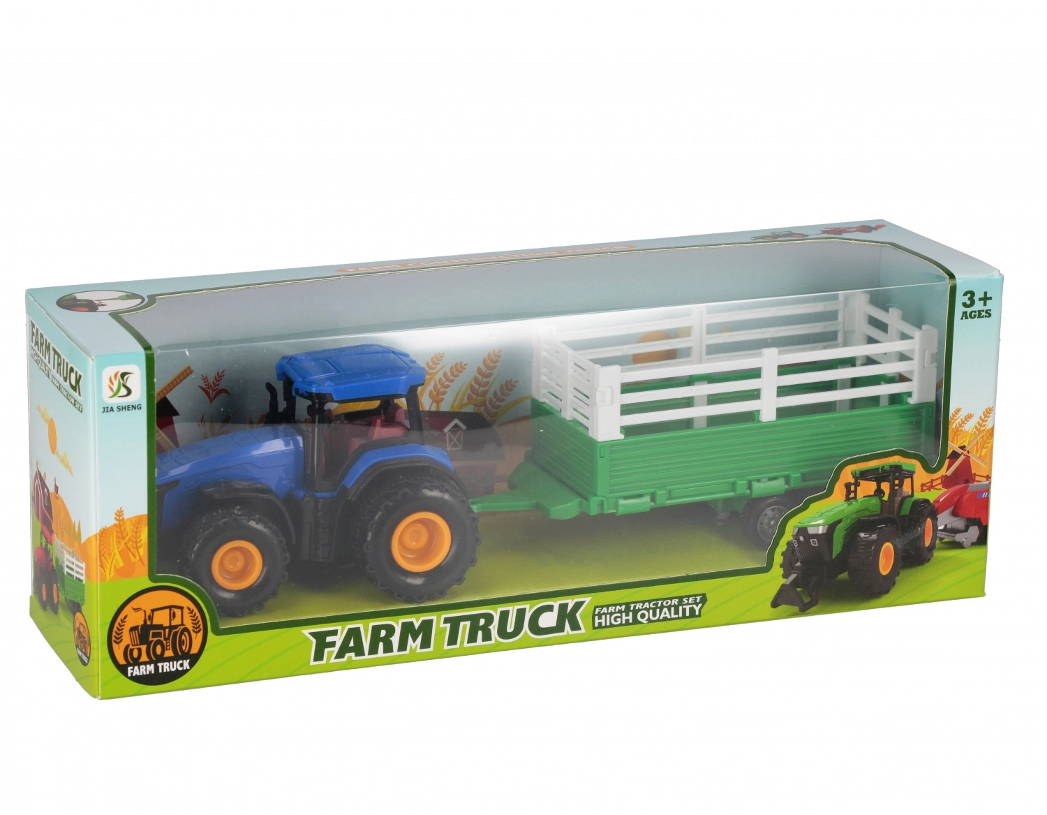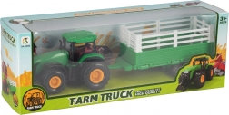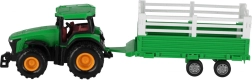 Set agricole ludique pour petits conducteurs – tracteur avec remorque amovible et fonction rétrofriction (pull-back). Il suffit de le tirer en arrière et le tracteur part tout seul. Détails réalistes, roues roulantes et remorque pour transporter la cargaison. Dimensions env. 33 × 12 × 9 cm, convient aux enfants dès 3 ans.