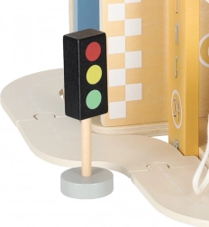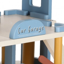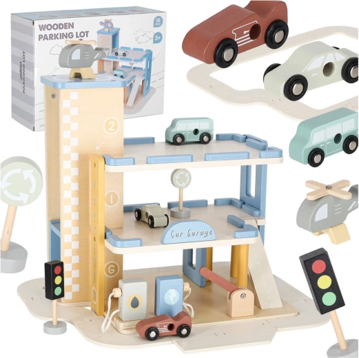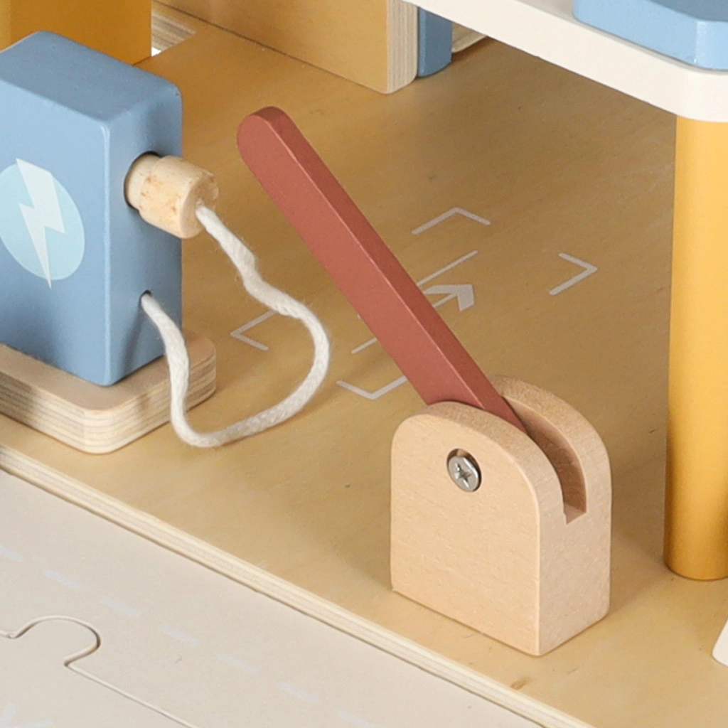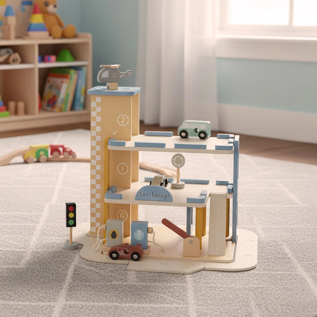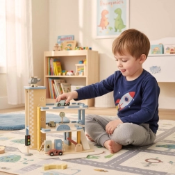Ce parking en bois à plusieurs niveaux réunit garages, service et station-service en un seul ensemble. Les enfants peuvent soulever les voitures avec un ascenseur mobile, emprunter les rampes, se garer à chaque étage et faire le plein de “carburant”. Ses teintes pastel douces et sa finition bois lisse sont agréables au toucher et s’intègrent visuellement dans toute chambre d’enfant.