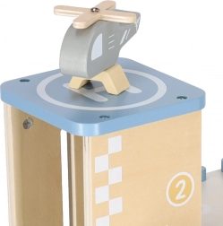Le coffret inclut 3 petites voitures en bois et un hélicoptère pour permettre les missions de secours, les courses et le stationnement tranquille.